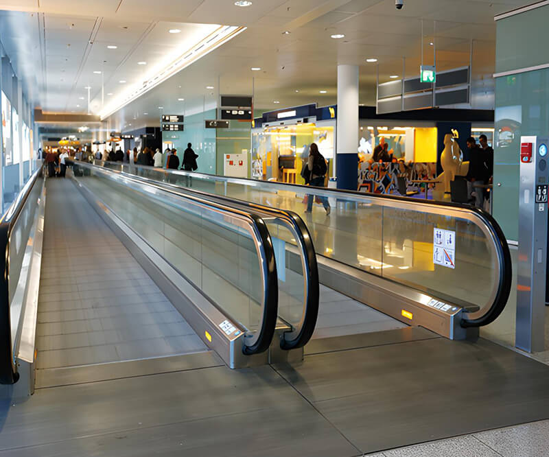 Moving walkways became an essential part of public transportation in ample train stations, airports and shopping malls. Whenever people carry bags, baggage or trolleys, sloped moving walkways provide the highest traffic throughput and safest way.